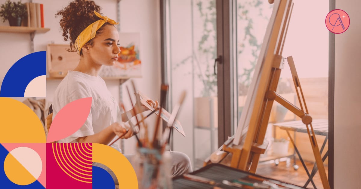 A person with curly hair tied back with a yellow headband sits at an easel in a bright studio, focused on painting a canvas. They hold a palette and brushes while looking closely at their work. Art supplies and paintbrushes are visible in the foreground, and a window lets in natural light. Colorful geometric shapes decorate the lower left corner of the graphic, and a small circular Collective Agency logo appears in the top right corner.