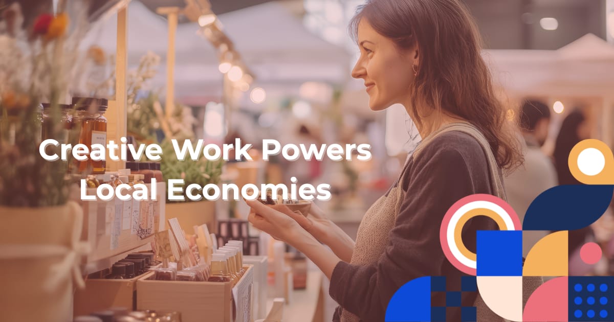 Woman browsing handmade goods at a local artisan market stall with text overlay reading “Creative Work Powers Local Economies.”