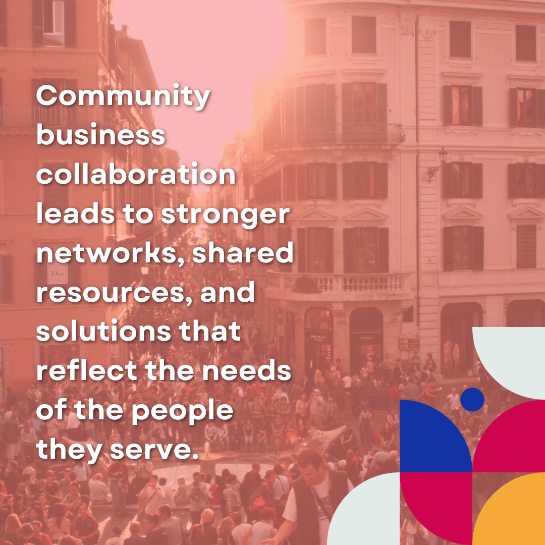 A crowded urban plaza at sunset is overlaid with the quote: "Community business collaboration leads to stronger networks, shared resources, and solutions that reflect the needs of the people they serve." The lower right corner features a colorful geometric design of semi-circles and dots in red, blue, yellow, and white.