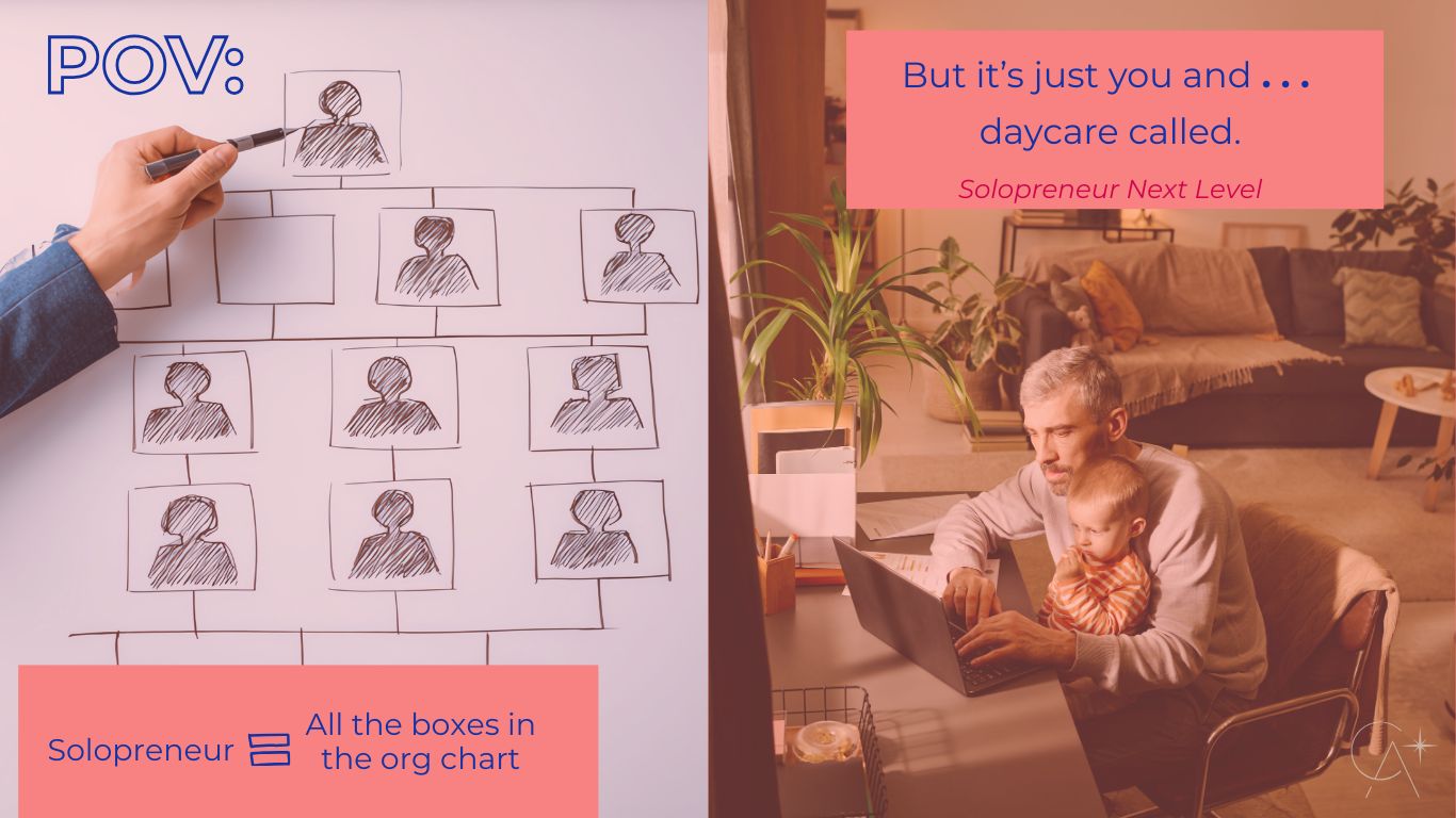 A split image showing two contrasting scenes. On the left, a hand points to a sketched corporate org chart on a whiteboard filled with many boxes representing employees. A pink text box at the bottom says: “Solopreneur = All the boxes in the org chart.” At the top left, bold text reads “POV:”. On the right, a man works on a laptop at a desk in his living room while holding a toddler on his lap, with a sofa, lamp, and coffee table in the background. A pink text box above him says: “But it’s just you and… the daycare called. Solopreneur Next Level.” In the bottom corner is the Collective Agency logo.