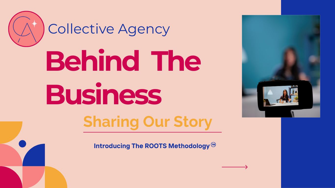 Graphic with the Collective Agency logo and the title “Behind The Business” in bold red text. Subheading in yellow says “Sharing Our Story,” with smaller blue text reading “Introducing The ROOTS Methodology™.” On the right side, a blurred background shows a woman speaking on camera, with the camera screen in focus displaying her image. Colorful abstract shapes decorate the corners.