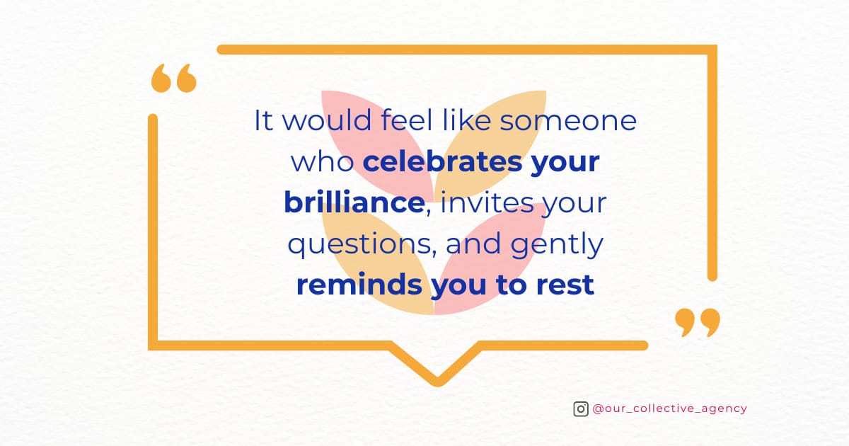 A graphic with a large orange quotation mark outline framing the text: “It would feel like someone who celebrates your brilliance, invites your questions, and gently reminds you to rest.” The words “celebrates your brilliance” and “reminds you to rest” are bolded in dark blue. Behind the text is a semi-transparent flower graphic in coral and gold. At the bottom right, small text reads: “@our_collective_agency” with the Instagram icon.