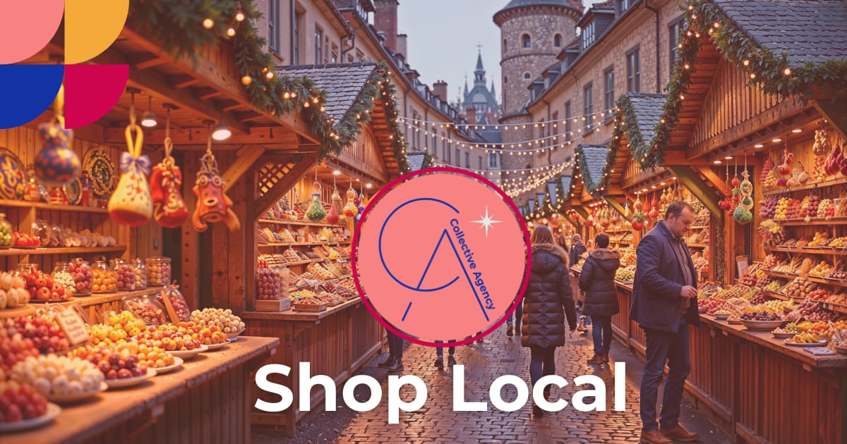 A festive outdoor market scene on a cobblestone street lined with wooden vendor stalls decorated with string lights and greenery. The stalls display colorful fruits, produce, and handcrafted goods. People bundled in winter coats browse the booths. At the center of the image is a circular pink Collective Agency logo with a star detail. In the lower portion, large white text reads ‘Shop Local.’ A geometric multicolor design element appears in the top-left corner