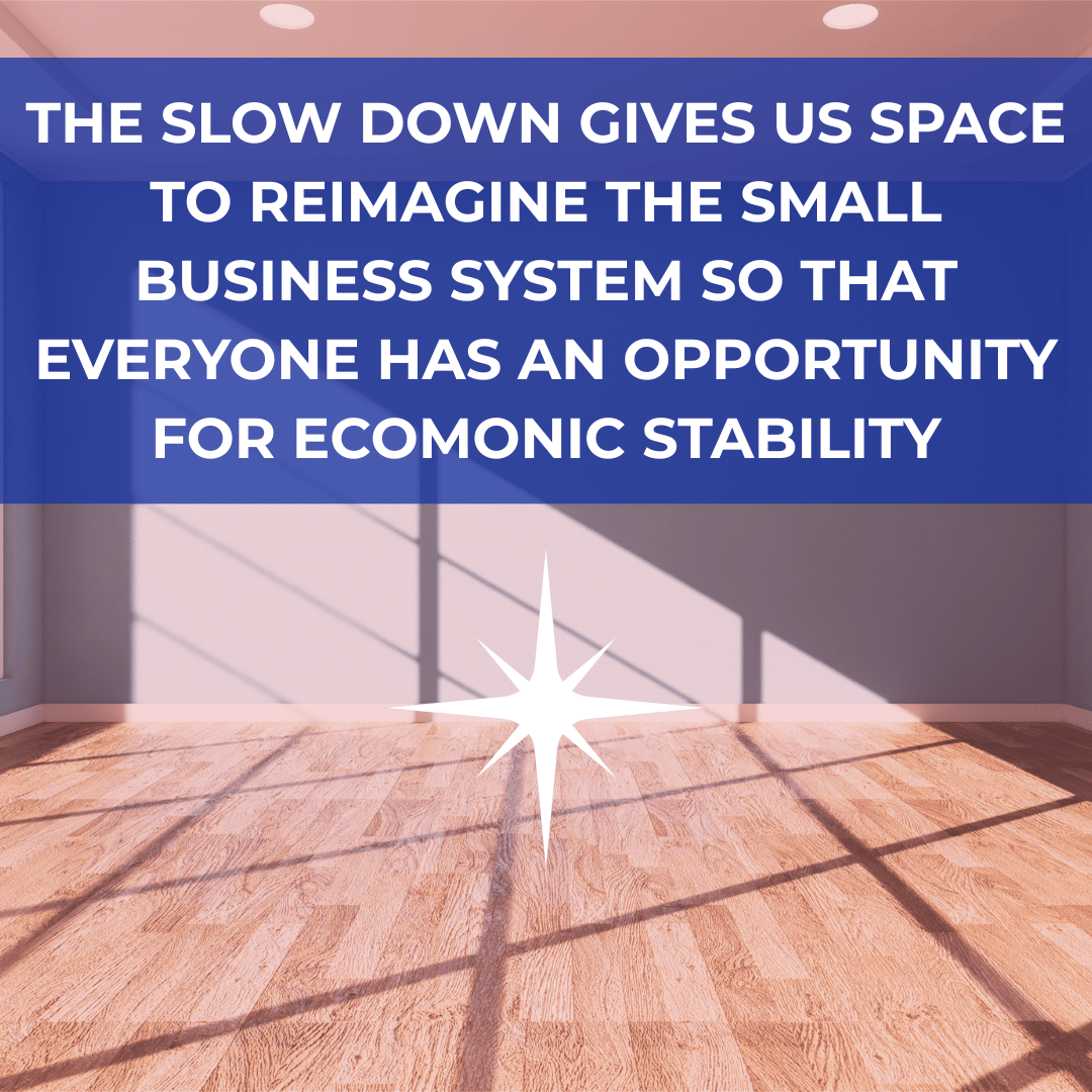 A bright, empty room with wooden floors and sunlight streaming through large windows, casting shadows on the floor. Centered at the top is a bold blue banner with white text that reads: “The slow down gives us space to reimagine the small business system so that everyone has an opportunity for economic stability.” Below the text, in the middle of the floor, is a white eight-pointed star, part of the Collective Agency visual branding.