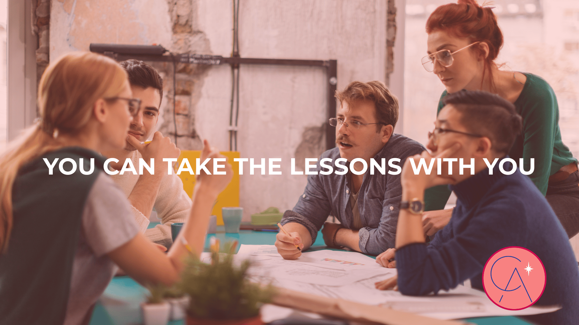 A group of five people of diverse backgrounds are gathered around a bright turquoise table in a creative, industrial-style workspace. They appear deep in discussion, with notebooks, sketches, and coffee cups spread out. One person gestures while others listen and take notes. White text across the center of the image reads: “You can take the lessons with you.” In the bottom right corner is the Collective Agency logo in pink and navy.