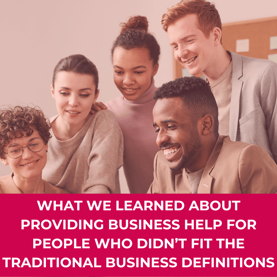 A group of five people of different races, genders, and hairstyles gather around a desk, smiling and looking at something together. They appear to be collaborating in a warm, casual office space. Over the bottom of the image is a bold magenta banner with white text that reads: “What we learned about providing business help for people who didn’t fit the traditional business definitions.”